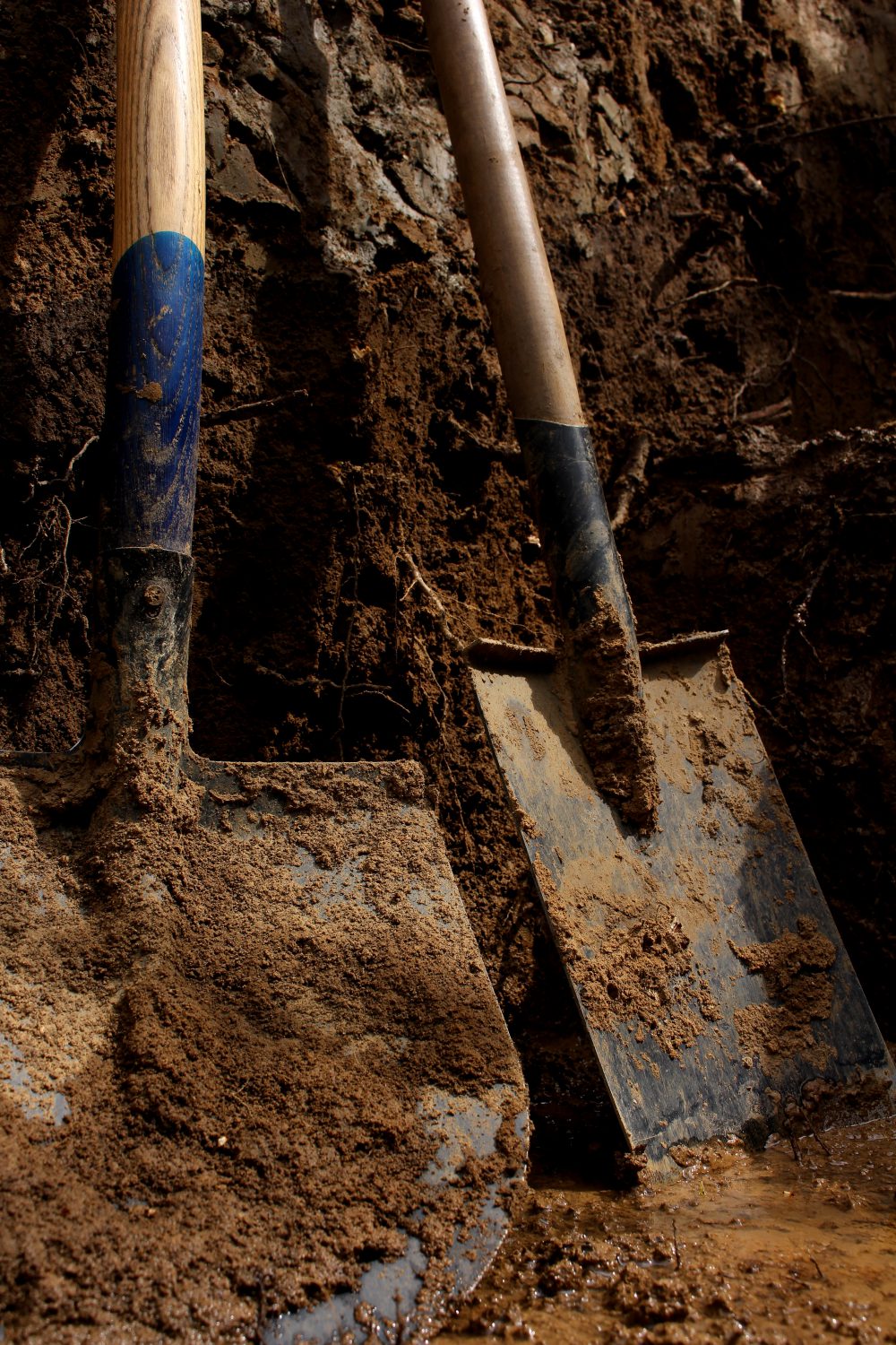 Die Baugrube ist jetzt fast zwei Meter tief – und matschig. Wir haben die wasserführende Schicht erreicht. Dass es in den letzten Tagen immer wieder geregnet hat, macht das Ganze nicht trockener. Pitschnasser Lehm – Schaufel und Eimer wiegen gefühlt Zentner, und die Arme werden immer länger.