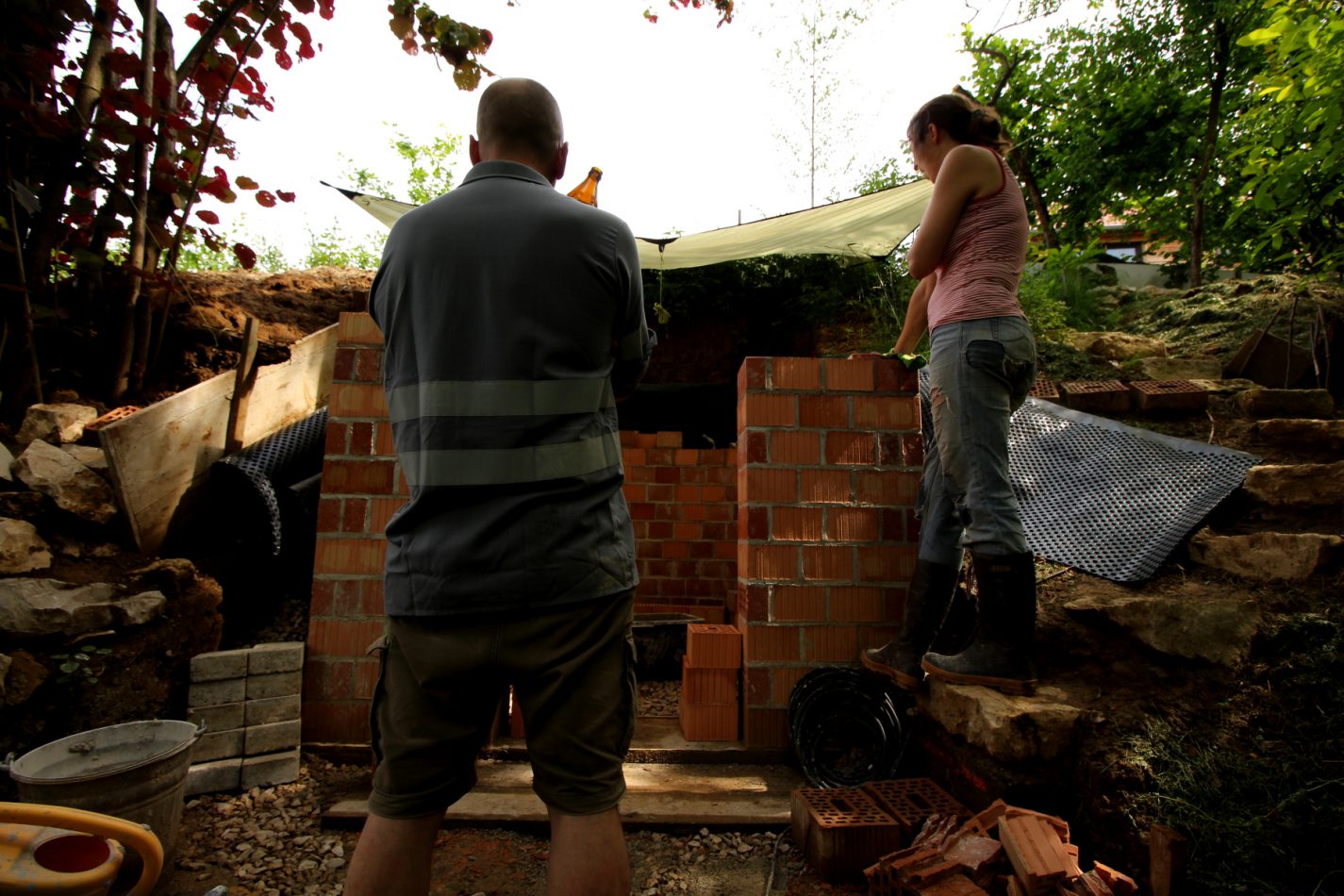 Ein Problem ist der ständige Regen. „Da kann man net mauern. Da schwemmt´s den Mörtel weg“, erklärte uns ein Maurer vom Fach. Doch wir schlagen dem maurerunfreundlichen Wetter ein Schnippchen und spannen unser Tarp über die Baustelle. Klein genug ist sie ja. Und wir sind schließlich nicht aus Zucker. Im Trocknen mauert es sich prima weiter. Es hat was Meditatives: Mörtel auf Ziegel, dann Ziegel auf Mörtel, mit Wasserwaage ausrichten, dann Fugen verstopfen – während um uns herum der Regen rauscht und dicke Tropfen auf Blätterdach und Tarp trommeln. Irgendwie tropisch, wenn´s noch ein bißchen wärmer wäre.