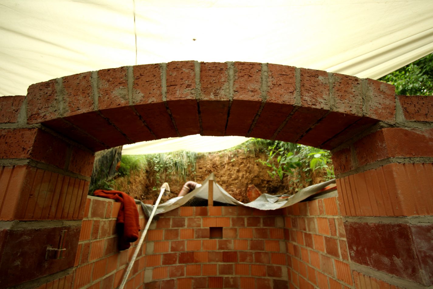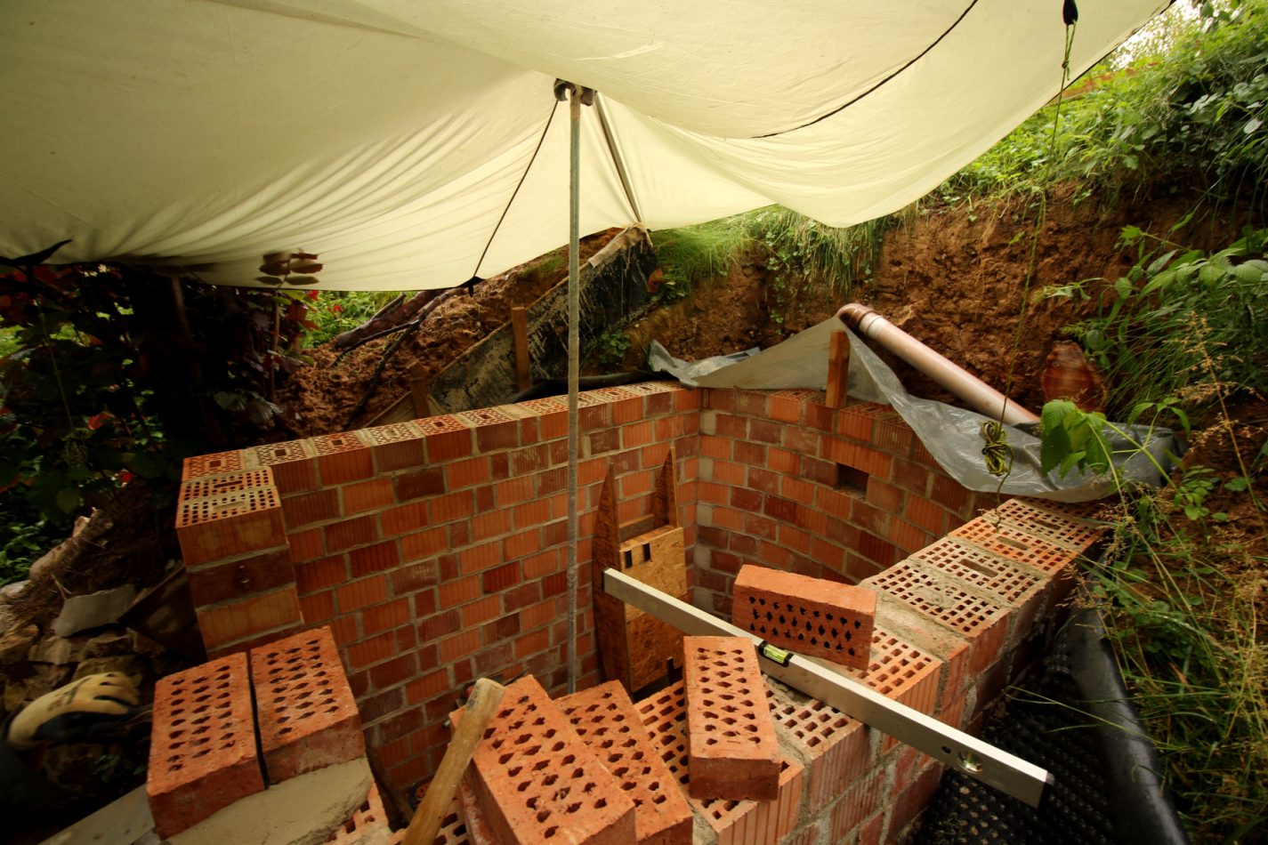 Blick in den noch offenen Erdkeller. Noch schützt das Tarp vor Regen und Sonne. Die letzte Mauerreihe wächst von links vorne gegen Uhrzeigersinn. Die Rundbogenschalung steht schon bereit.