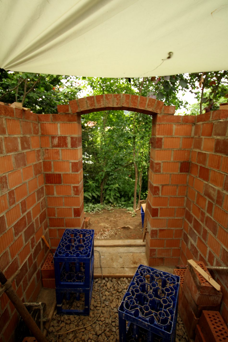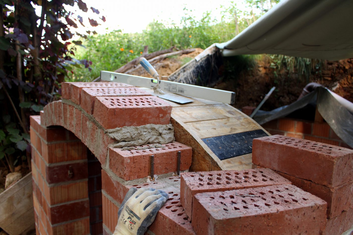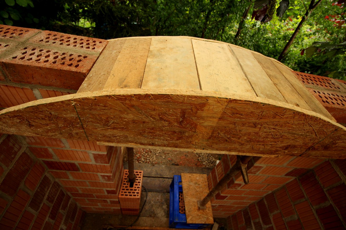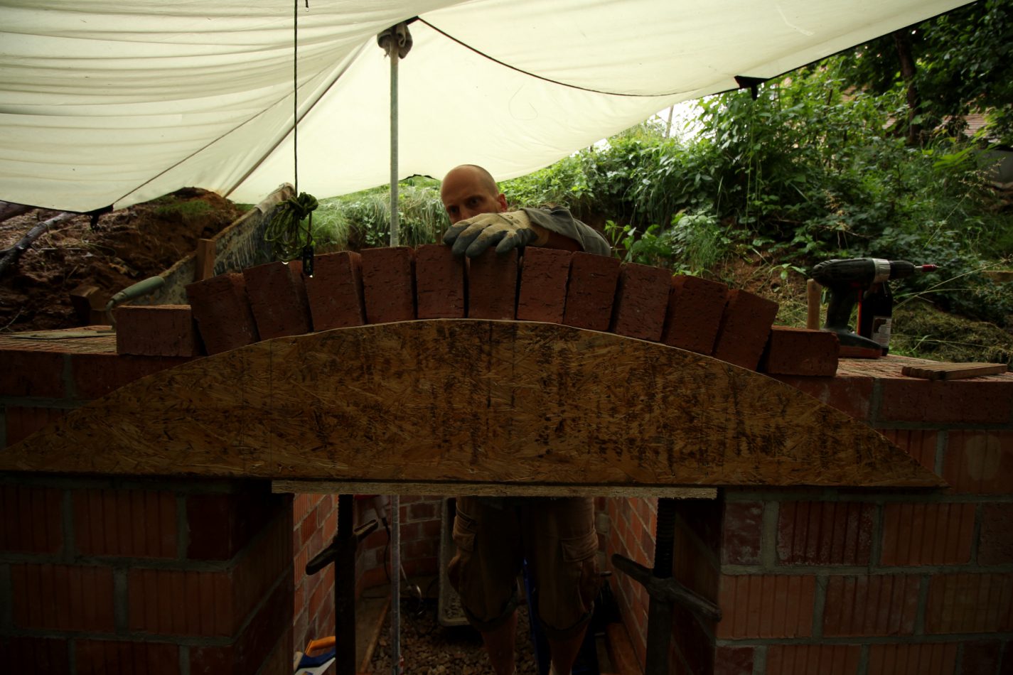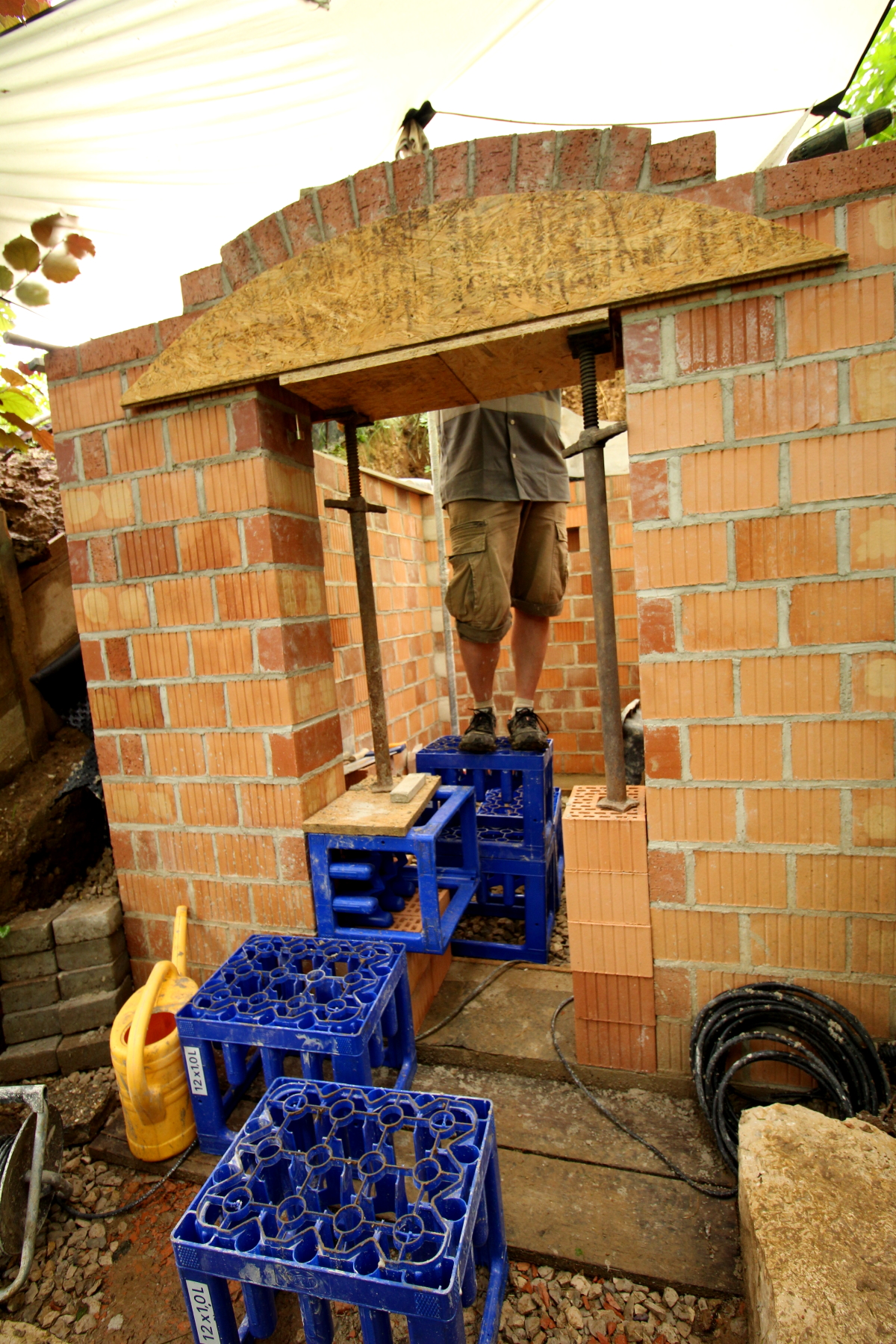 …zugegeben auf einer sehr improvisierten Konstruktion – das ruft ja geradezu nach Professionalisierung – kann´s endlich losgehen: Rundbogen mauern! Die Spannung steigt!