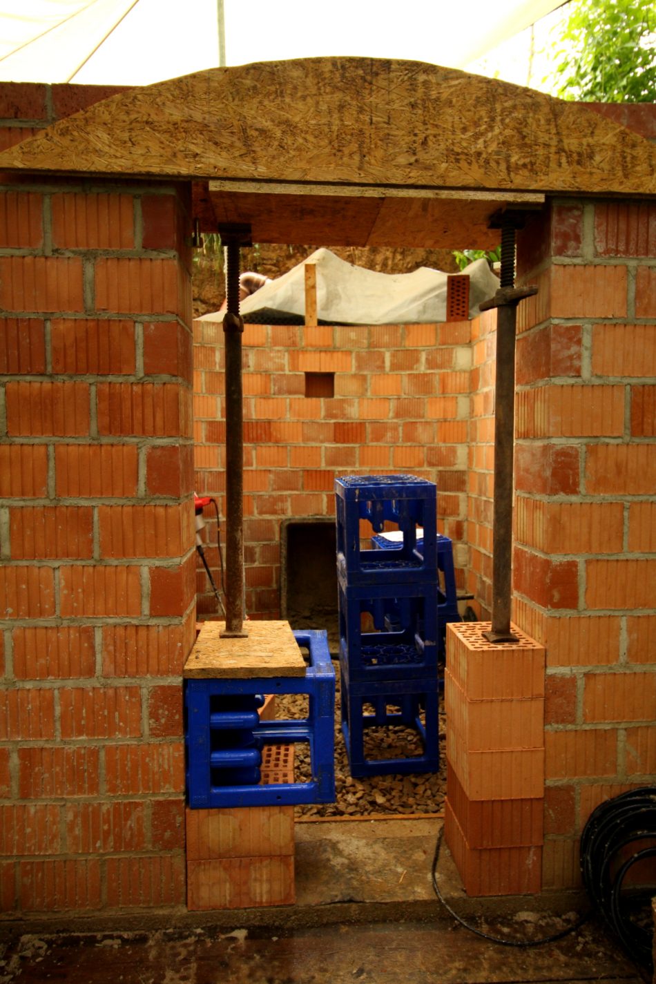 Das Open-End-Mauern oder „Mauern bis es dunkel wird“ oder „bis der Hunger nagt“ hat nun ein Ende. Denn nach spätestens 30 Ziegeln = 2 Rundbogenreihen ist Schluss. Der flüssige, tropfende Mörtelpamp muss erst trocknen, um seine volle Klebekraft zu entfalten, und die Ziegel in der Schwebe zu halten. Dann erst können wir die Schalung für die nächsten beiden Reihen verschieben.