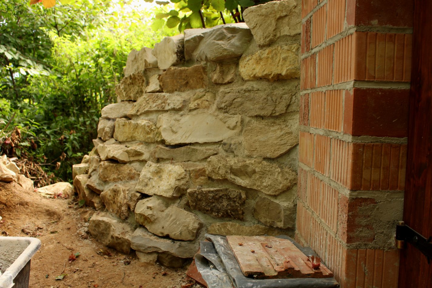 Rechts ist die Natursteinmauer schon fertig, links fehlen noch ein paar Reihen.