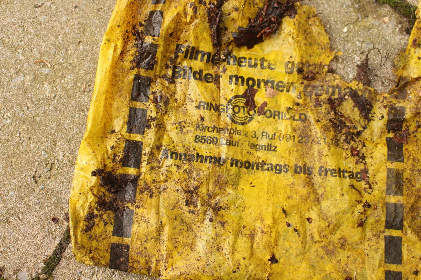 Was passiert mit einer Plastiktüte, die im Wald landet? Sie liegt und liegt und liegt, bis sie vom Regen ein Stückchen weitergespült wird. Landet sie nicht in einem Bach, liegt sie wieder. Viele Jahre, unversehrt… – beachte die vier(!)stellige Postleitzahl!