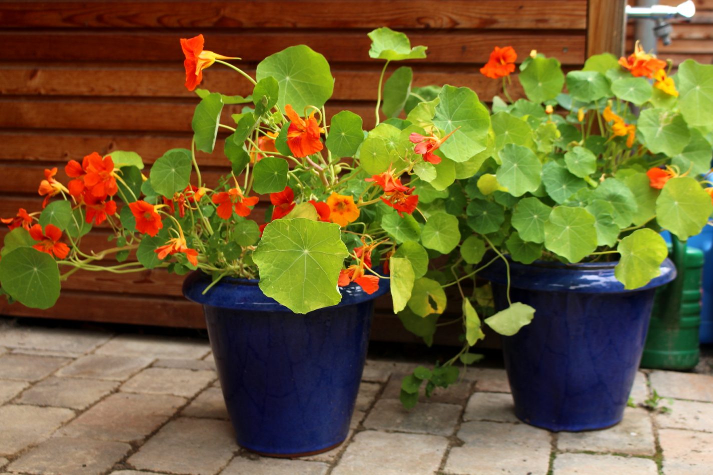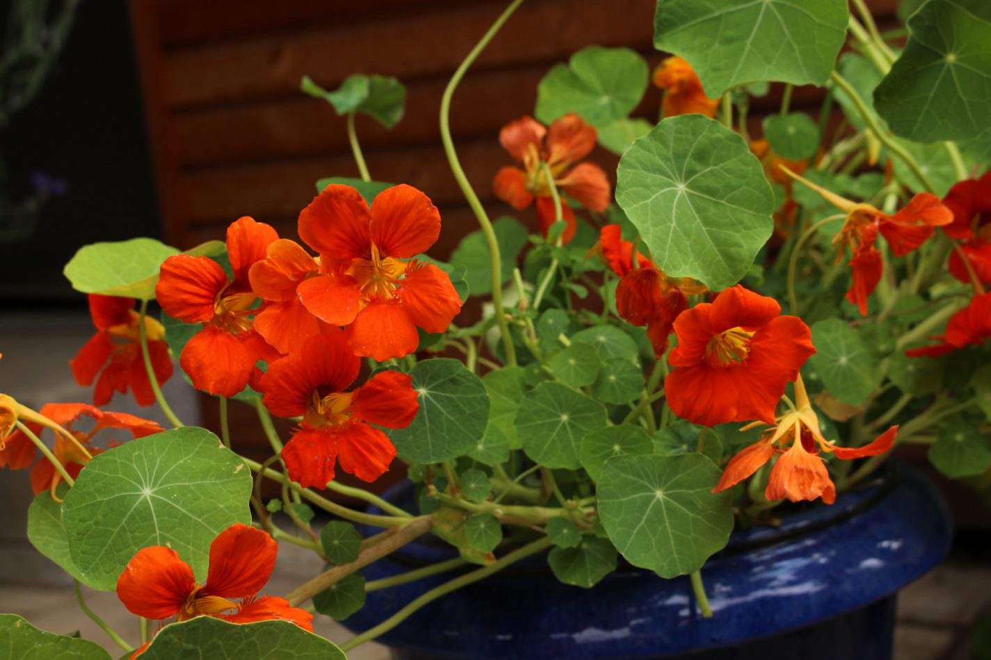 Und eins dieser Antischneckenwunderkräuter soll doch tatsächlich die Kapuzinerkresse sein! Ich war mir ja absolut sicher, dass die Nacktschnecken der Kapuzinerkresse den sofortigen Garaus machen werden, sobald sie ihre Keimlingsköpfchen aus ihren Samen steckt. Also landete die Kapuzinerkresse bei mir auf der „Nicht-pflanzen-oder-säen-weil-nur-Schneckenfutter“-Liste und ich beachtete sie nicht weiter. Erst, als ich diese hübschen blauen Tontöpfe (ich liebe blaue Tontöpfe!) geschenkt bekam, die ich unbedingt mit reichblühenden Pflanzen bestückt vor unsere Haustüre stellen wollte, griff ich im Laden zu den Tütchen mit Kapuzinerkressesamen. Hier sind sie ja gut geschützt vor jedem Schneckenhunger!