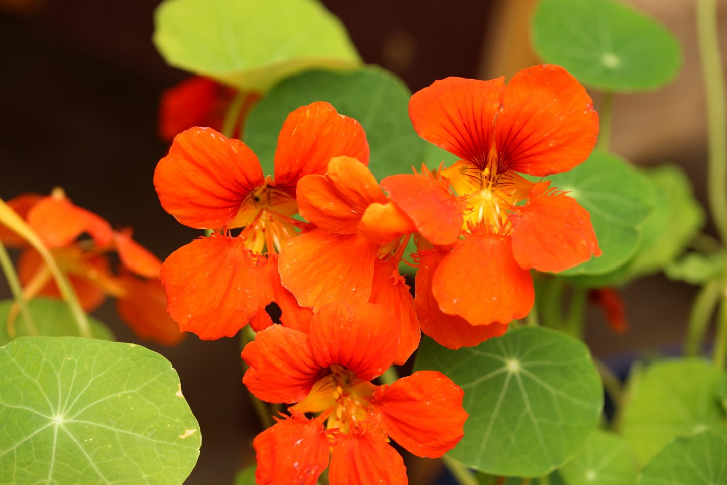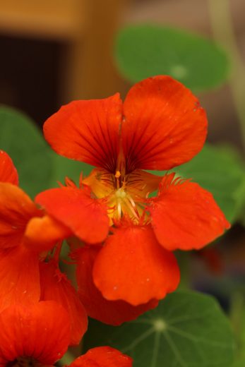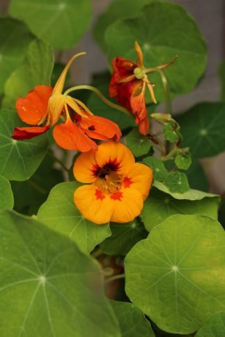 Ich stelle mir gerade vor, wie nachts, wenn Dunkelheit und dörfliche Stille den Garten einhüllen, die Kapuzinerkresse schweigend ihre rundlichen, fliegenklatschartigen Blätter schwingt und mit ihren bezahnten Blüten jede Schnecke in die Flucht schlägt…