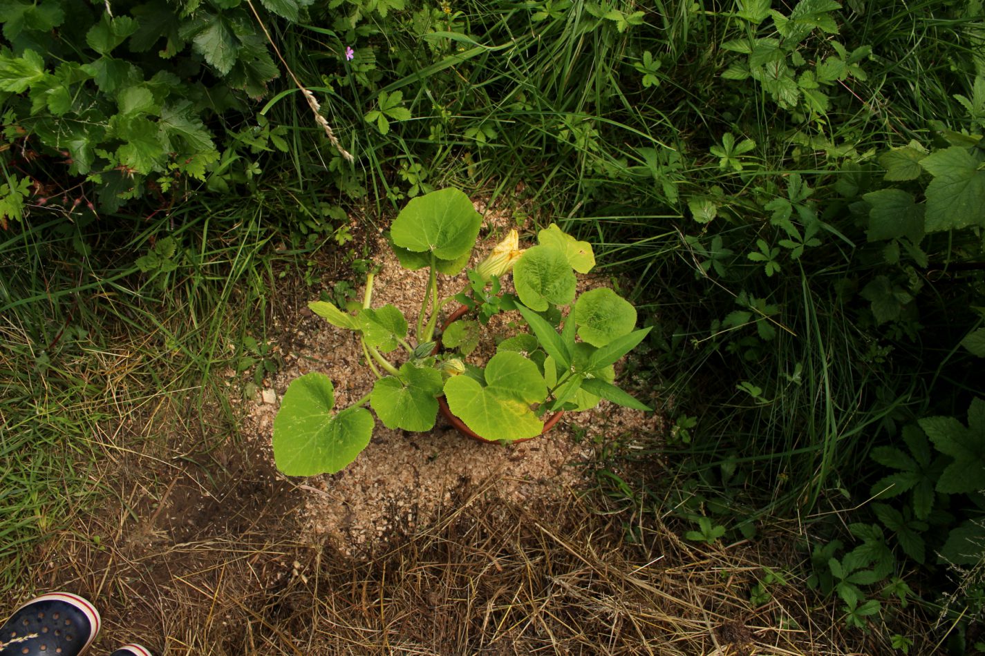 Am nächsten Morgen schlüpfte ich als erstes in die Gummistiefel und stapfte durch´s nasse Gras zu König Kürbis. Er bot einen jämmerlichen Anblick: Die Kapuzinerkresse war komplett verschwunden, Schleimspuren überall, weitere Löcher in den Blättern und die neuen Blüten abgefressen. Ich habe kein Foto gemacht, so wollte ich König Kürbis´s Anblick nicht der Öffentlichkeit preiszugeben.