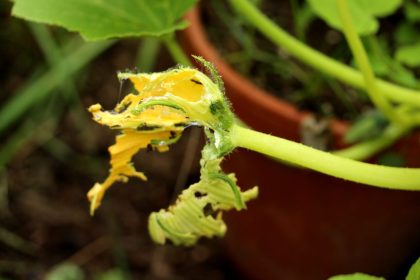 Es dauerte ein paar Tage, aber dann fanden die ewig hungrigen Schnecken König Kürbis doch. Die Blüten: zerfressen. Die Blätter: löchrig. Schleimspuren überall. Abgekämpft und erschöpft sieht er aus, der einst stolze König Kürbis.