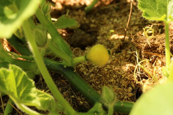 Insgesamt wächst Kürbis König noch langsam, aber er hat schon so viele Blüten! Mindestens zwei Mal täglich schaue ich nach ihm und freue mich über jede neu auftauchende Blütenknospe. Seit der Verteidigungswall aus Sägespänen die Schnecken fernhält, gibt es morgens auch keine bösen Überraschungen mehr.
