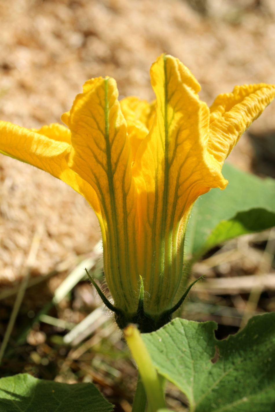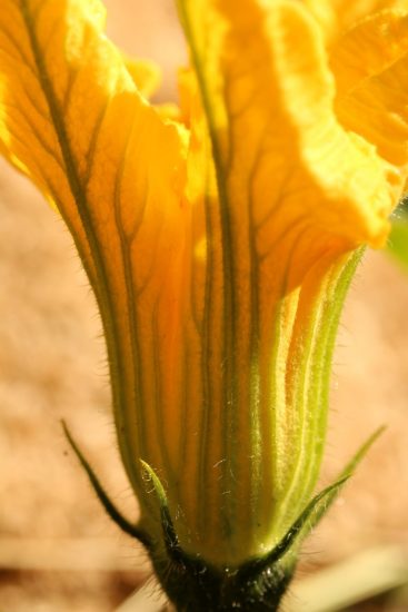Sehen die Blüten nicht toll aus?! Große satt gelbe Kelche, die irgendwie was von Hibiskusblüten haben. Tropisches Feeling auf dem Graskompost – hihi!… wie verzaubert, oder? Morgens öffnen sich die Blüten, gegen Vormittag fangen sie schon an zu welken und ab mittags sehen sie aus wie zusammengepappt.…eine ziemlich vergängliche Schönheit also. Diese Blüte geht ihrem Blühende schon entgegen.Dafür wird nun das grüne Geäder an der Außenseite der Blüten sichtbar.Was für ein Zufall! Da fliegt mir doch glatt eine Honigbiene ins Bild! Damit hätten wir die Frage nach den Bestäubern auch gleich beantwortet. Hummeln, so lese ich nach, gehören ebenfalls zu den Kürbisblütenbesuchern. Von beiden gibt es bei uns zum Glück (noch) reichlich. Also eine Sorge schon mal weniger.Diese Honigbiene steigt gerade aus den Tiefen der Kürbisblüte auf.Mehrmals klettert die Biene aus der Blüte heraus (hier bereits zum dritten Mal), um erneut in ihrem Inneren zu verschwinden.Keine Ahnung, wie oft sie zurück in den Blütenkelch purzelte. Jedenfalls ist sie jetzt mit Pollen nur so zugeklebt!Ei, ihr lieben Bienchen, kommt nur geflogen! Ich fühle es: Die Kürbisernte ist bei so viel Bienenbesuch gesichert!Im Abflug erwischt! Und auf zur nächsten Kürbisblüte! Da lacht des Kürbisgärtnerins Herz!