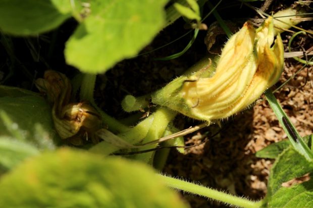 Gut gelaunt stapfe ich am nächsten Morgen durch den Garten, um König Kürbis den allmorgendlichen Besuch abzustatten. Ich hebe seine immer größer werdenden Schirmblätter an – OH NEIN! Alle Blüten sind abgeknickt! Warum das denn? Wer war das denn? … Nachdem ich mich von der Schockstarre etwas erholt habe, suche ich nach Verdächtigen. Es gibt keine Schleimspuren, der Sägespänewall ist trocken und dicht. Mäuse? Vögel? Neue Gärtnerverzweiflung steigt in mir auf. Ich muß unbedingt recherchieren, aber ich komme einfach nicht dazu…