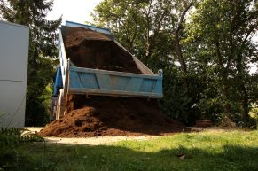 Als wir letztes Jahr im September den Erdkeller fertig gemauert hatten, mußte er, wie der Name schon sagt, noch unter die Erde. Dafür haben wir uns acht Kubikmeter Erde anfahren lassen.