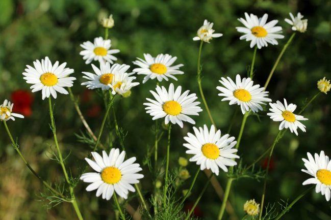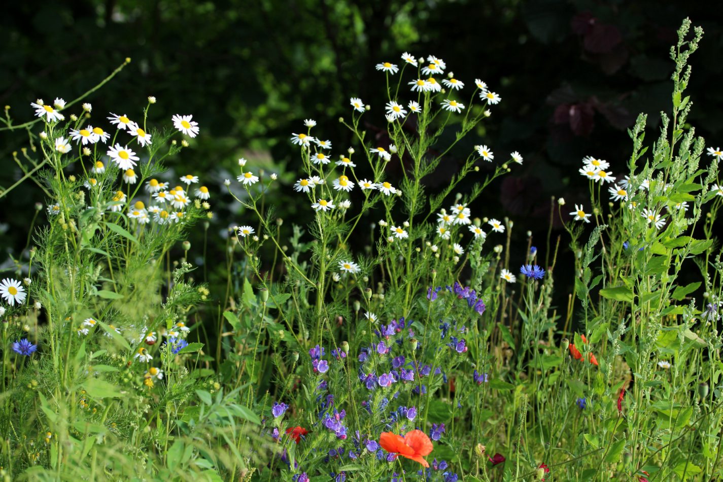 Mittlerweile sind all diese Pflanzen so gut wie verblüht. Nur einzelne Kamillen- und Natternkopfblüten halten sich noch.