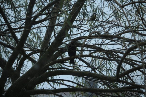 Ich war sehr gespannt, wie die Vögel es dort annehmen würden… Theoretisch gibt es eine super Anflugschneise vom Zwetschgenhang über unsere Hecke in die Trauerweide, die bei den Vögeln generell sehr beliebt ist; mit weiteren möglichen Zwischenstationen im Blumenbeet (in dem ich natürlich noch nichts „aufgeräumt“ habe), der Felsenbirne und dem Kanadischen Ahorn (der mittlerweile endlich zu einem kleinen Bäumchen herangewachsen ist). Andersherum könnten sich die Vögel wie gehabt über die Obstbäume heranpirschen oder von der Eiche über das Mädesüßgestrüpp in den Ahorn bzw. in den Gelben Senf, der Gründüngeransaat auf dem Kartoffelacker, der natürlich auch noch steht, und als Deckung benutzt werden kann…