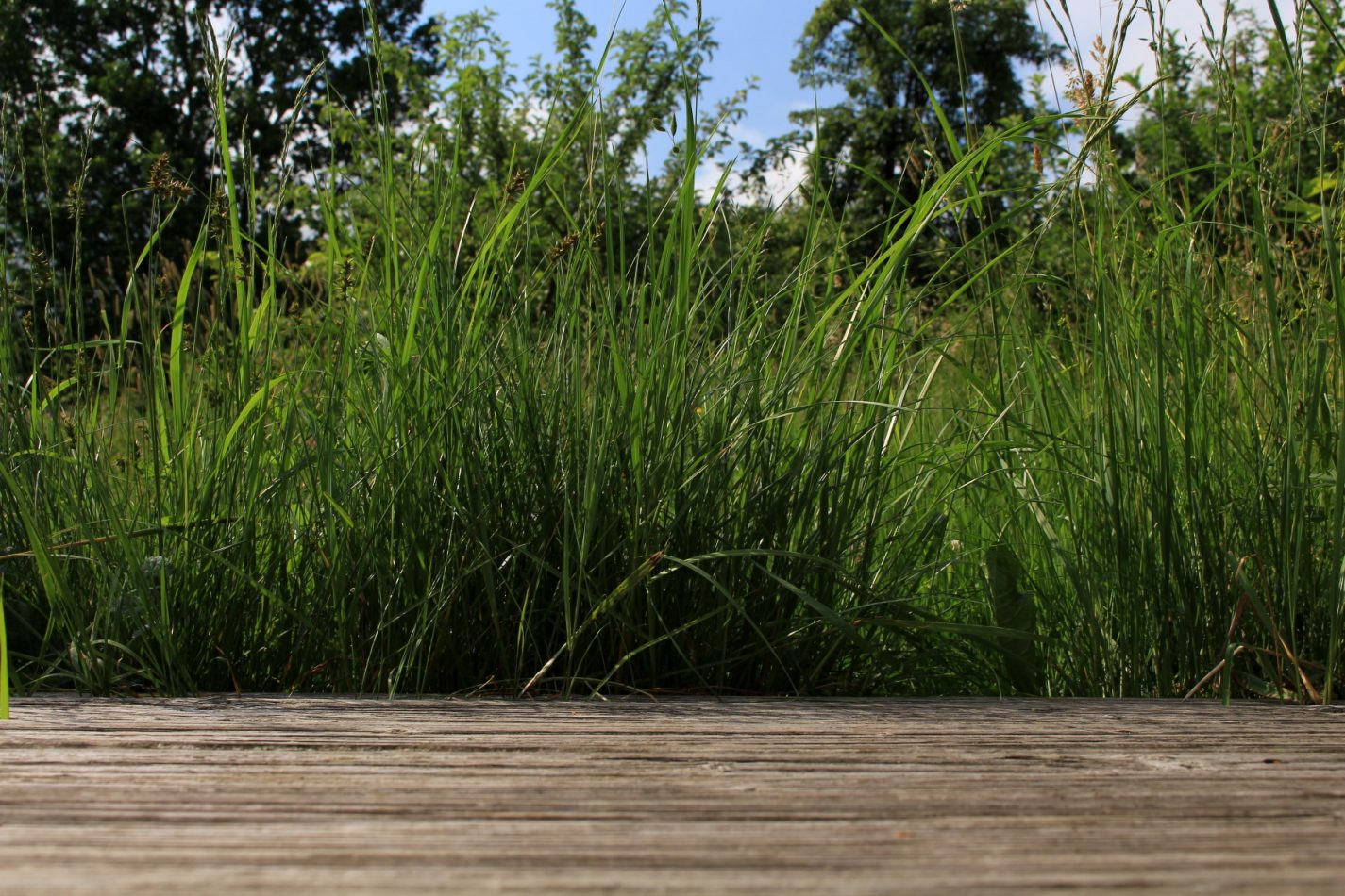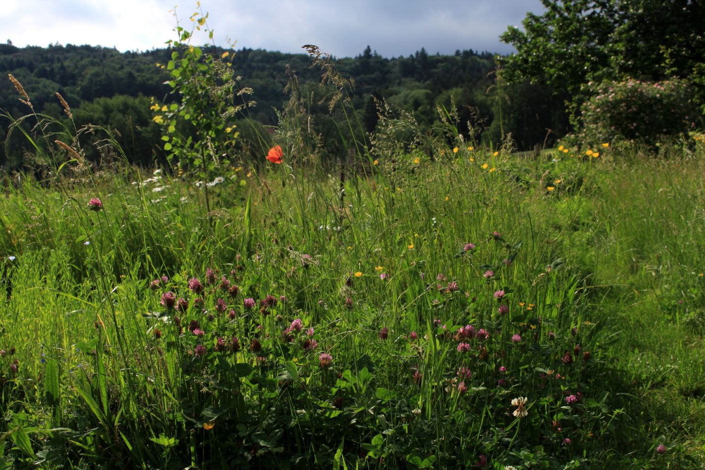 Der Kontrast macht´s! Wege zwischen hohem Gras. Ich behaupte mal: In jedem Garten gibt es Flächen oder Streifen, die eh nur mit dem Rasenmäher betreten werden. Warum also nicht mal wachsen lassen? Nicht nur Grashüpfer werden sich freuen 😉 Sie brauchen hohes Gras zum Leben.Ziergräser könnten nicht schöner sein: das heimische Knäuelgras, Dactylus glomerata.Terrasse im Grünen.Blühstreifen am Haus entlang.Kunterbunt für kein Geld, einfach nur, weil man´s stehen lässt: Rotklee, Margerite, Mohn und keine Ahnung wie viele Grasarten.Und noch ein Weg durch die hohe Wiese!Hier laufen wir eigentlich nie herum. Also warum mähen? Rot: Mohn. Gelb: Pippau. Blauer Punkt: Kornblume. Was noch nicht blüht, aber als Büschel vorne schon erkennbar ist, ist die rosafarbene Kronwicke.Wiese im Morgentau. Ist das nicht idyllisch? Wie im Urlaub auf der Alm!