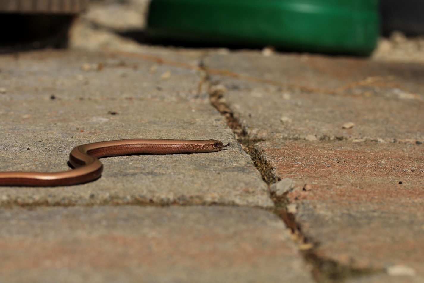 Die kleine Blindschleiche erschrak genauso wie ich und wollte natürlich schnell davon… aber irgendwie kam sie kaum vom Fleck. Erstaunlich, wie schlecht sie sich auf dem Pflaster vorwärtsbewegen kann, obwohl sie sich schlängelte und wand wie wild. Schließlich wollte sie ja flüchten. Anscheinend konnte sie sich aber auf dem Pflaster nicht richtig vorwärtsschieben. Fast war ich versucht, ihr zu helfen. Doch aus Sorge, ihr noch mehr Stress zuzufügen und zu riskieren, dass sie ihren Schwanz abwirft, ließ ich es lieber. Diesen Notfallplan sollte sie sich besser für Katze, Marder und Co aufheben.