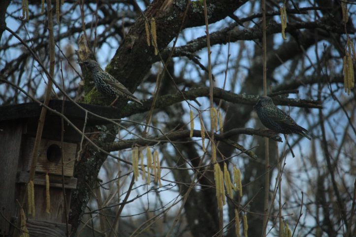 Deswegen weiß ich auch noch, dass es dieses Jahr in der 1. Januarwoche war, als ich oben in den Kronen der Eichen und Birken unserer Straße ein vertrautes Knarxen und Knorxen hörte. Denn die Weihnachtsbeleuchtung war gerade angegangen. Ich glaubte meinen Ohren nicht zu trauen – jetzt schon? Aber es bestand kein Zweifel, die Stare waren zurück! Wenn sie diesen (nicht vorhandenen) Winter überhaupt weg waren…