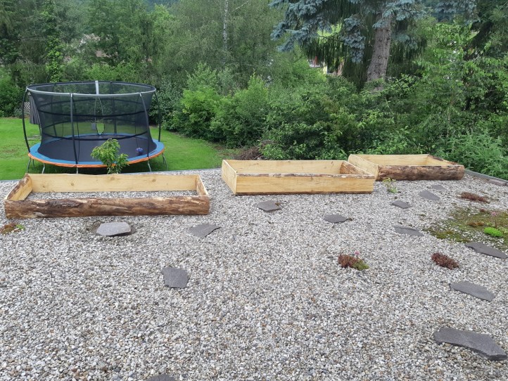 Bis wir diesen Sommer weggeworfene Bretter entdeckten. Lagen da so herum, herrenlos, mitten im Irgendwo im Wald. Hui! 🙂 Das war ja geradezu eine Einladung! Zack, eingepackt. Und schon haben wir gesägt und geschraubt. Und schon hatten wir drei Hochbeete für´s Carportdach.