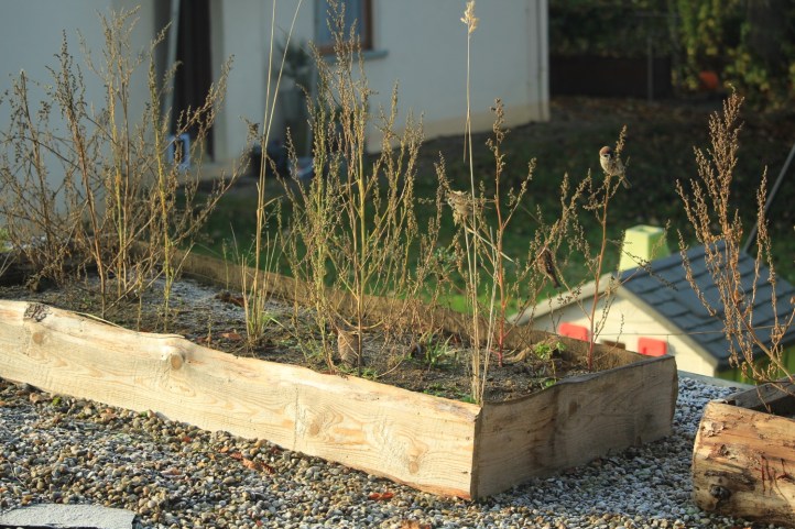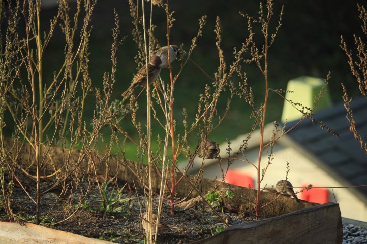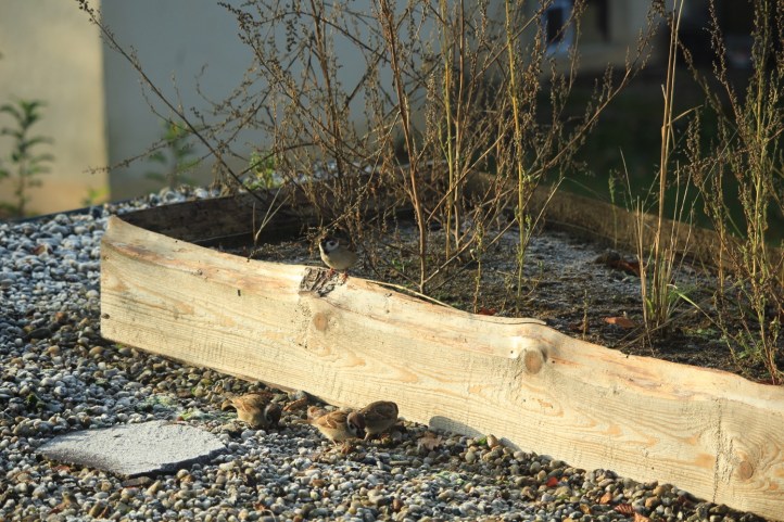 Über zwei Wochen lang besuchte jeden Morgen ein kleiner Spatzentrupp unsere drei Hochbeete und frühstückte dort ausgiebig. So geht Vogelfütterung eigentlich! Von wegen Miesenknödel und sonstiges Schischi. Eigentlich bräuchte es das gar nicht, wenn, ja wenn… die ganze Welt voll mit Orten wäre wie diesen, wo sich die Vögel durch den Winter füttern könnten!