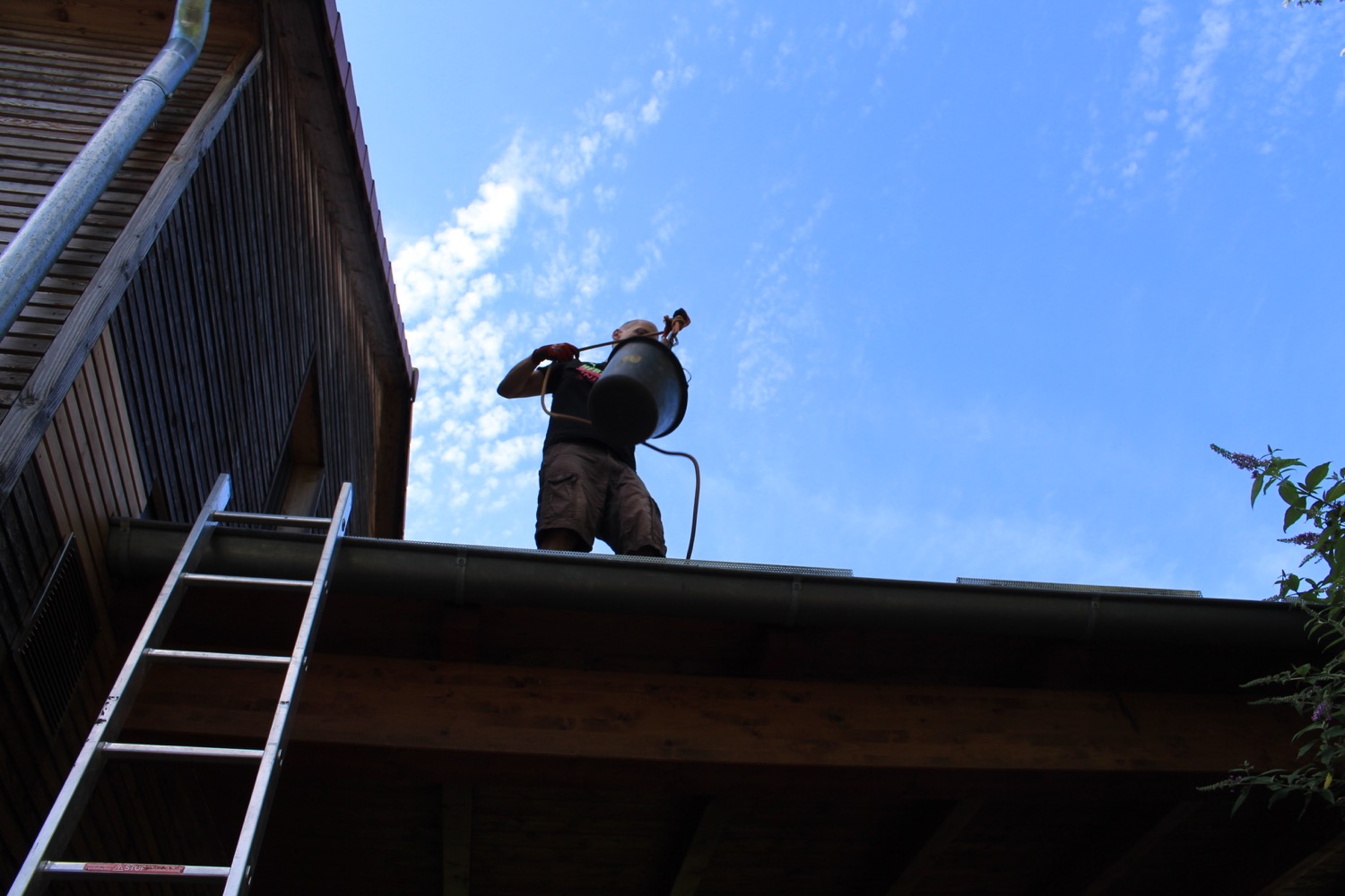 Zweitens: ziemlich rotte Standbalken und- mauern drunter, da wage ich nicht, etwas anderes als Wellblech draufzutun.