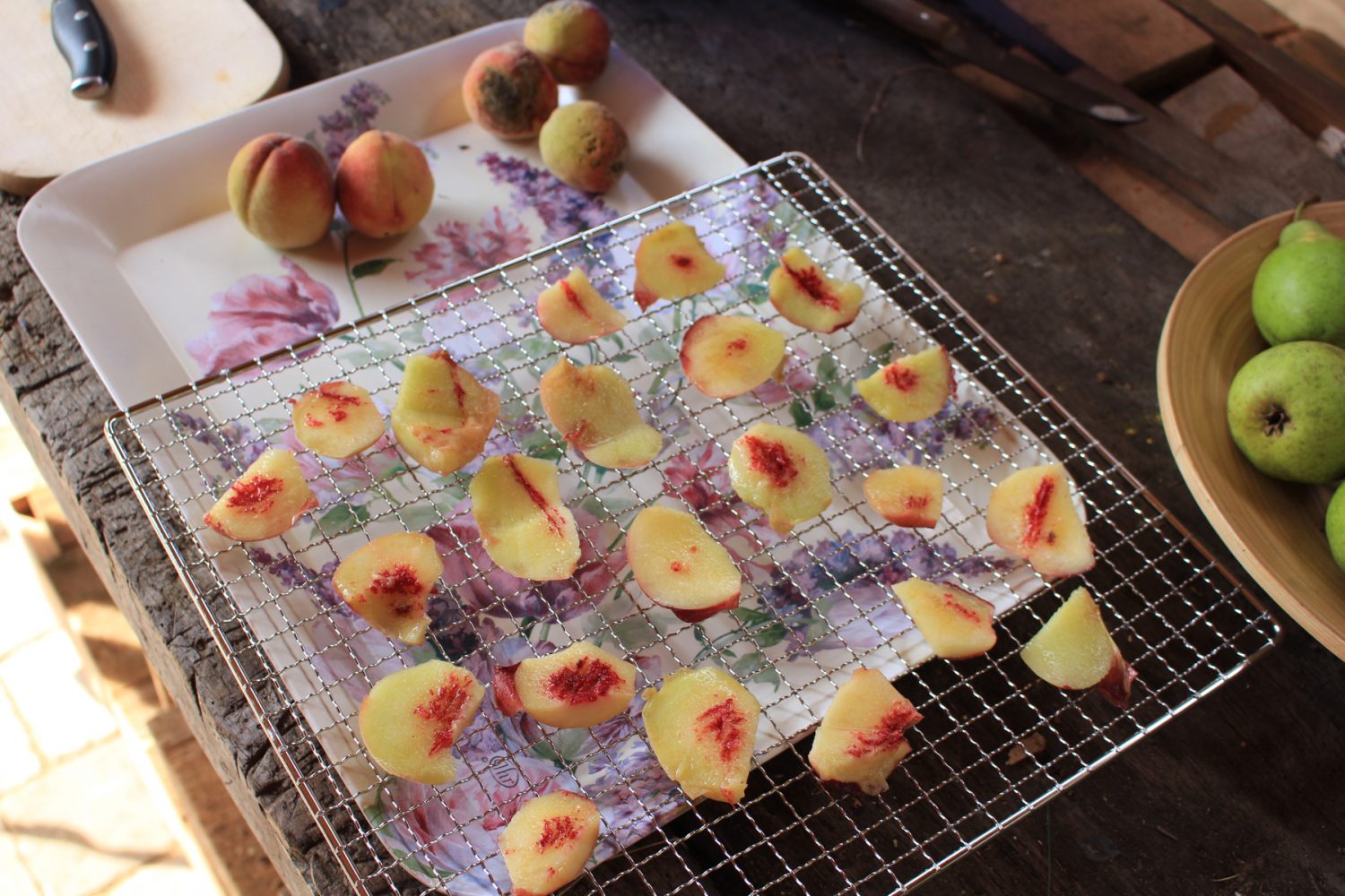 Meine ersten Dörrobjekte waren jedoch Pfirsiche! Aus dem Garten von Freunden. So leckere Früchte! Wahnsinn! Und der Baum hat dieses Jahr getragen wie verrückt. Kistenweise haben unsere Freunde geerntet, und ein paar sind auch zu uns gewandert.