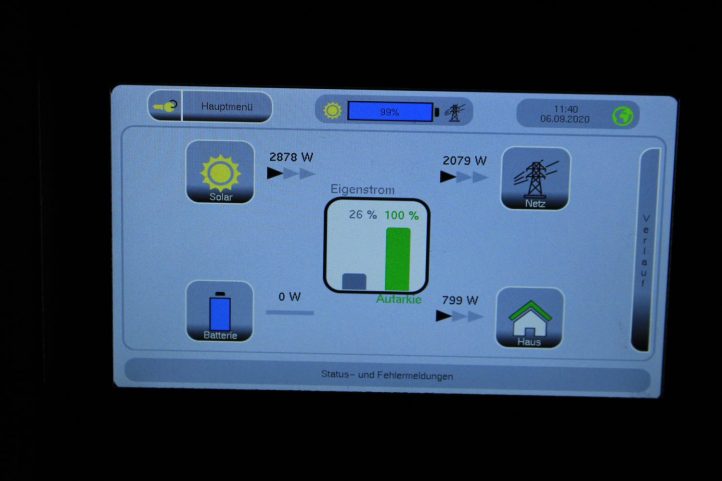 An dem Tag war der Akku schon um 11.40 Uhr voll. Die Momentaufnahme zeigt außerdem: Über 2800 W fing die Solaranlage ein, rund 800 W davon brauchten wir gerade, 600-650 W davon flossen in den Dörrofen. Der Rest (an die 2.000 W) wurde ans Netz abgegeben.