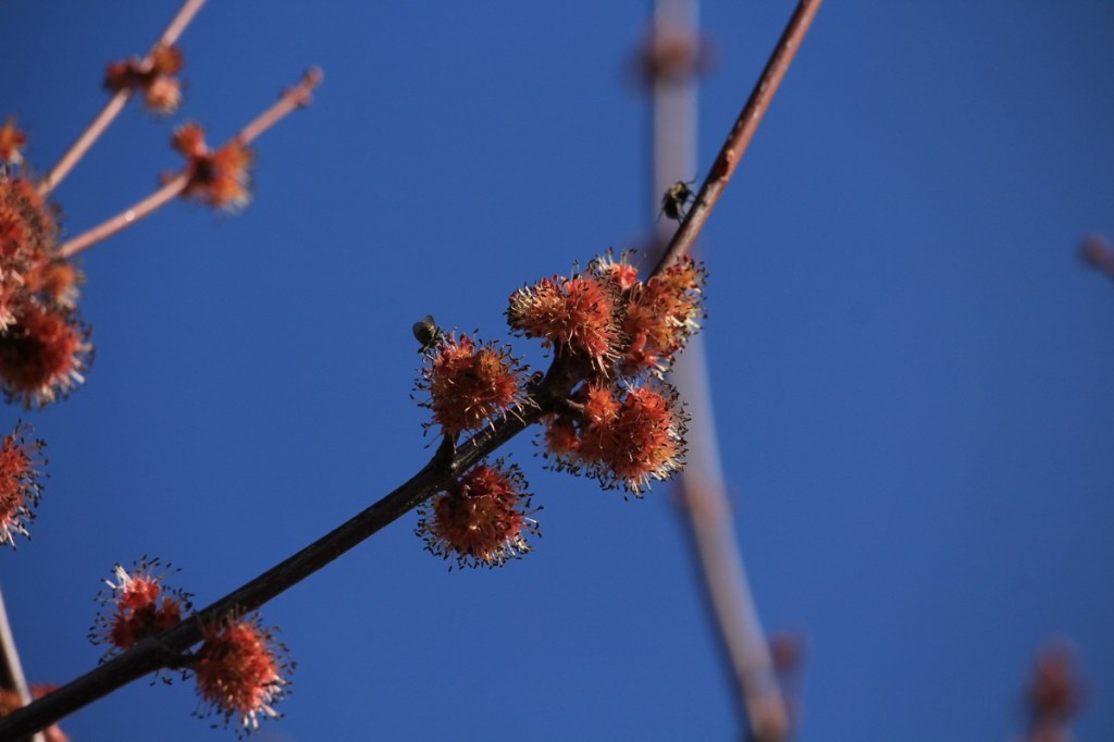 13 Kanadischer Ahorn – Dass er blüht, haben mir Nachbarins Honigbienen veraten, die fleissig von Blüte zu Blüte summten.