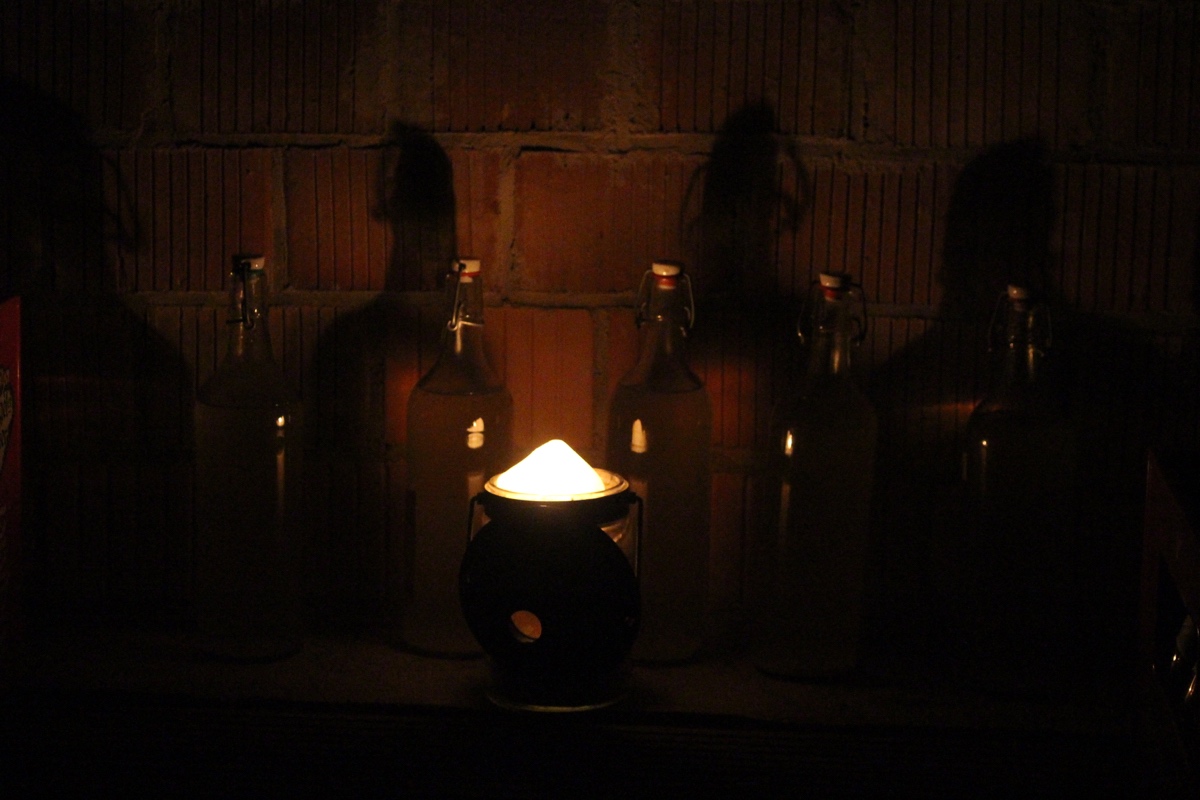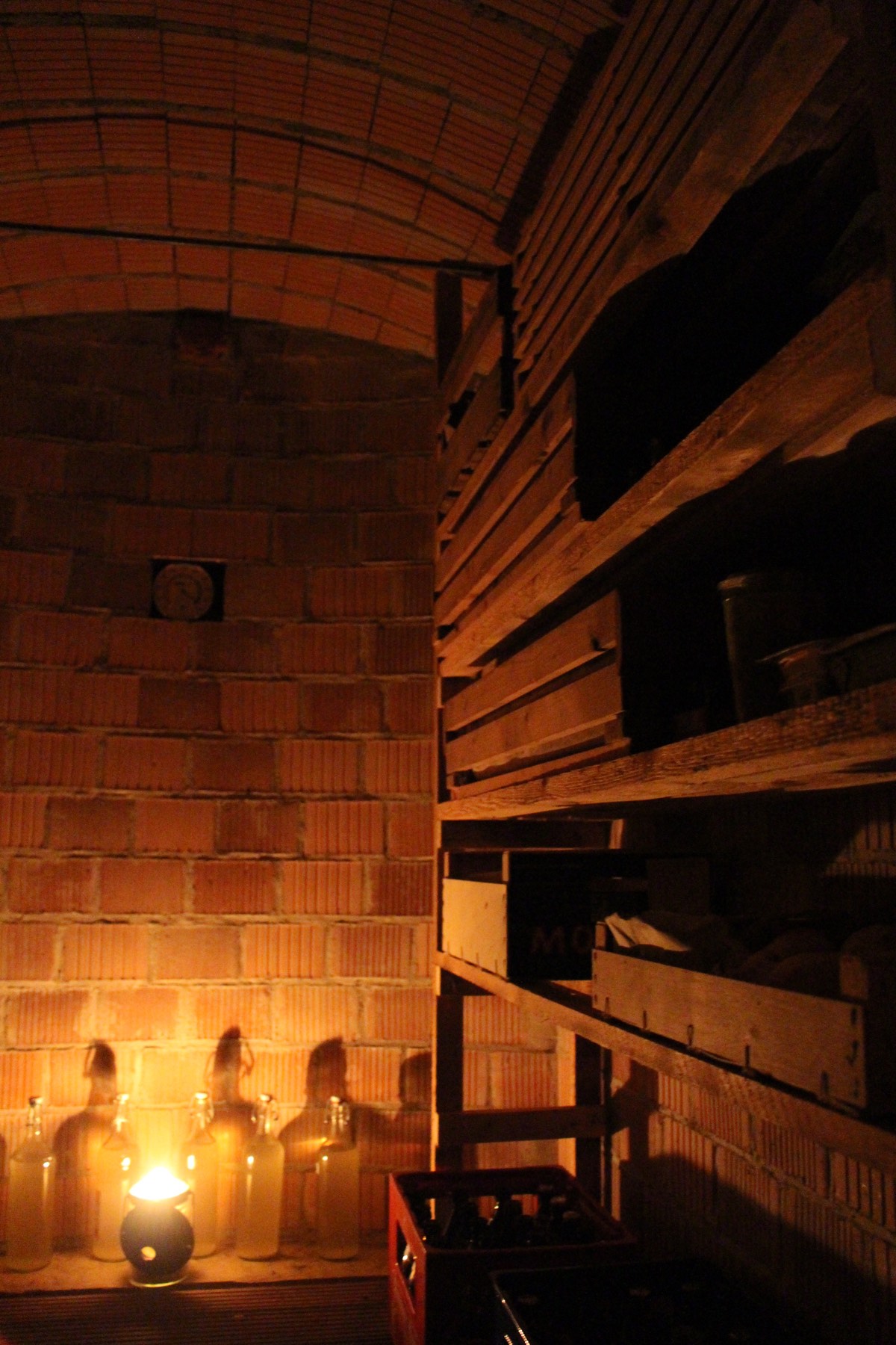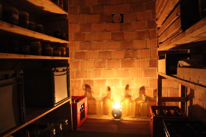 In den frostigen Januartagen hielt wieder eine Kerze die Temperatur über dem Gefrierpunkt. Jedes Mal bin ich erneut erstaunt, was so eine kleine Flamme bewirkt! Es ist dann immer richtig gemütlich, in dem Raum unter der Erde, vor allem wenn man aus der Minusgrad eisigkalten Nachtluft hereinschneit, man vielleicht sogar erst noch die Treppenstufen von Schnee befreien mußte, um hierher zu kommen. Um einen herum lagern Äpfel, schlummern Marmeladengläser, Gläser voll mit eingemachten Birnen und Zwetschgen, der eigene Apfelessig und eben alle Kühlschranksachen samt ein paar Bierkästen… gibt es etwas heimeligeres als so eine Vorratskammer unter der Erde?