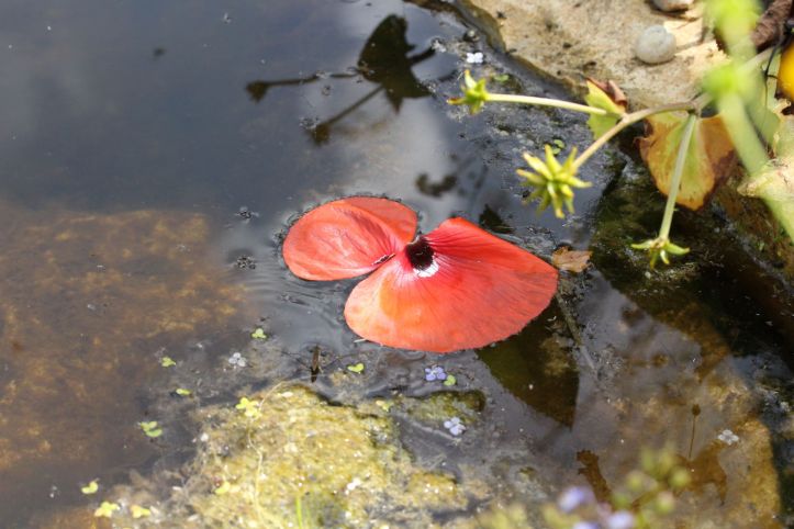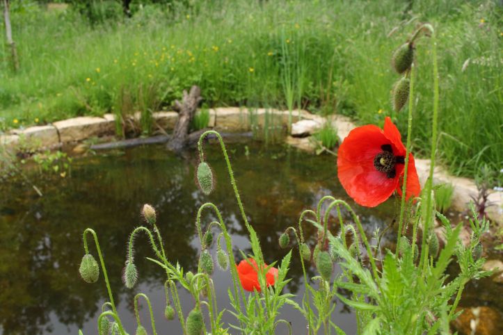 Auf den Mohn am Teich freu ich mich schon seit letztem Herbst. Als wir beim Bau des Teiches im Vorjahr Erde um die Steinumrandung aufhäuften, haben die Mohnsamen ihre Chance genutzt, und sind schon letzten Spätsommer hier auf der offenen Erde aufgegangen. Da sieht man mal, dass das weit verbreitete „im Frühjahr aussäen“ nicht immer so seine Richtigkeit hat. Man sollte dann säen, wenn die Pflanzen auch ihre Samen verteilen. Und das ist in der Regel nicht im Frühjahr.