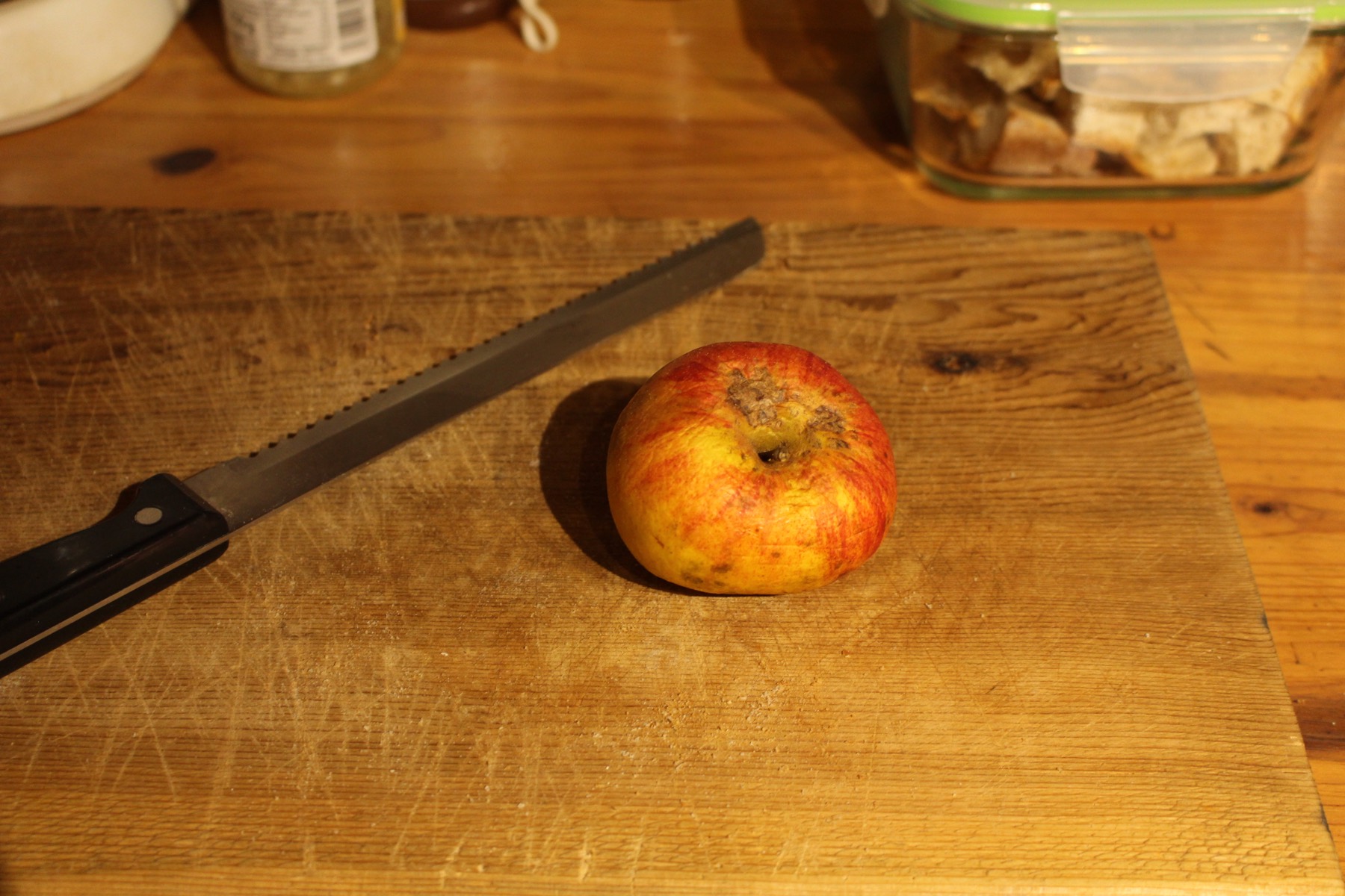 Da liegt er, unser letzter Apfel aus dem Herbst 2021. Dem Erdkeller sei dank hat er so lange durchgehalten. Nun kommt er ins Müsli. Ab morgen gibt es gedörrtes Obst, auch aus dem Garten, der Solarenergie auf unserem Dach sei dank.