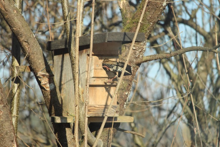 Das spannende ist, dass bereits im Herbst, bevor die Stare in den Süden ziehen, der Kasten schon begutachtet wird, über mehrere Tage hinweg, immer wieder. Das hab ich nun schon mehrmals beobachtet. Und jedes Mal frag ich mich wieder: Na, bist du denn derjenige, der hier schon im Herbst vorbeigeschaut hat? Eine Frage, auf die ich leider nie eine Antwort bekommen werde. Aber gut vorstellbar ist es! Schließlich würde es sehr viel Sinn machen, sich schon im Herbst den Ort rauszusuchen, wo man im Frühjahr brüten will. Dann verliert man nicht so viel Zeit, wenn man von der langen Reise zurückkommt. Schließlich gilt bei der Suche nach guten Nistplätzen v. a. eins: Sehr schnell sein! Viele gibt´s nicht, und wer zuerst kommt, brütet.