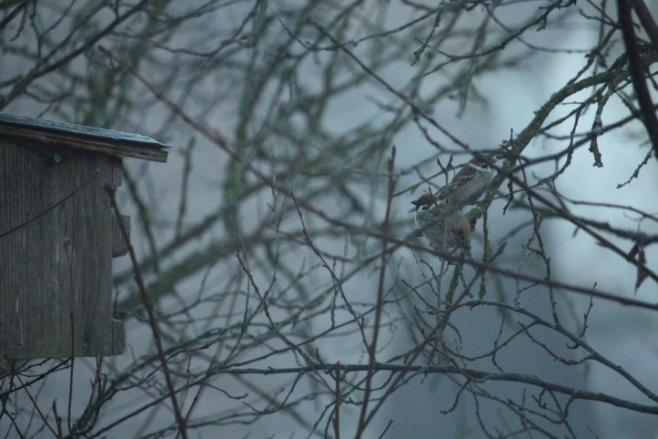 Während der Specht hämmert, sitzen vor dem Häuschen die beiden Bewohner. Man könnte sich einbilden, dass ihr Gefiedergeplustere, ihr von einem Ast auf den anderen Gehüpfe und ihr leises vor sich hin Tschilpen nach resigniertem Protest klingt…