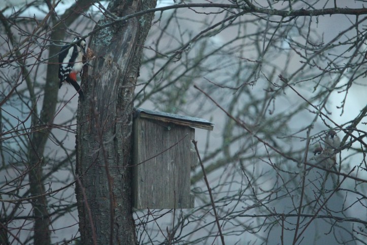 Der Buntspecht hämmert wild auf seinem Zapfen in seiner Spechtschmiede herum. Beachte rechts unten im Bild: das Vogelhäuschen, das am selben Baum hängt…